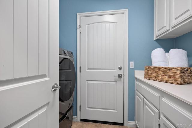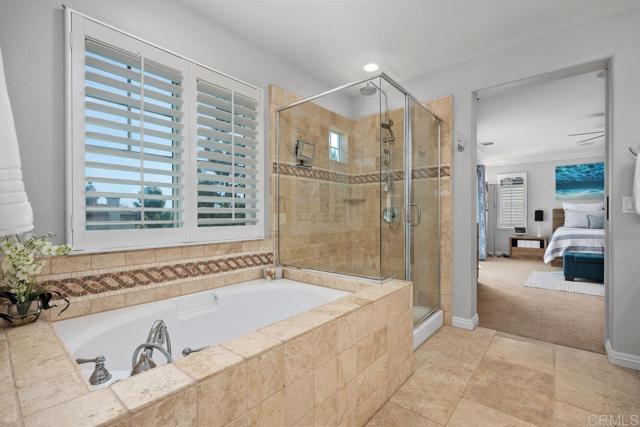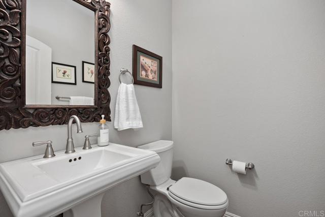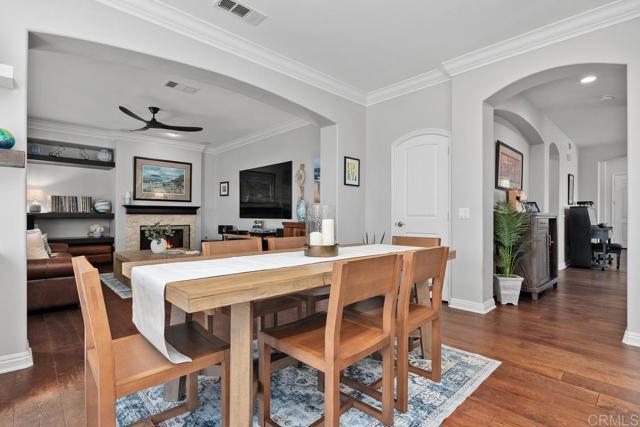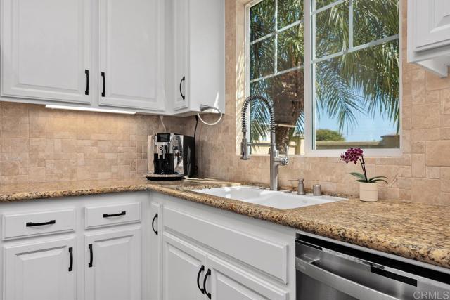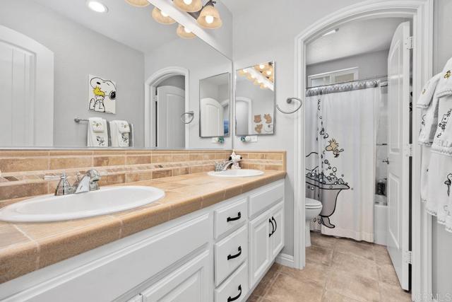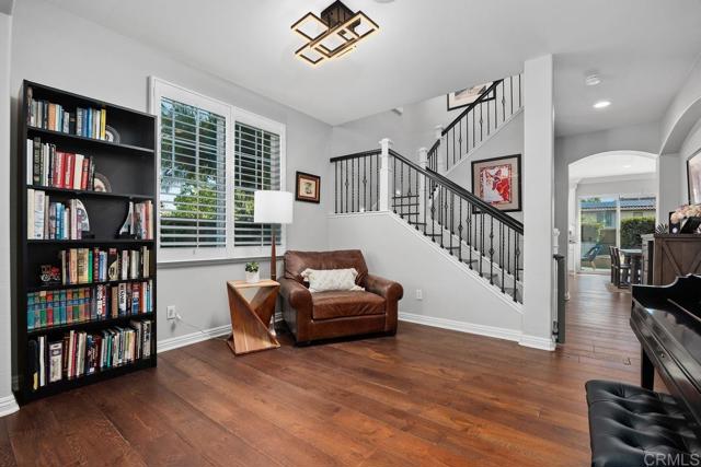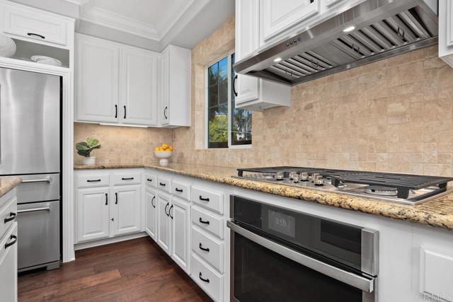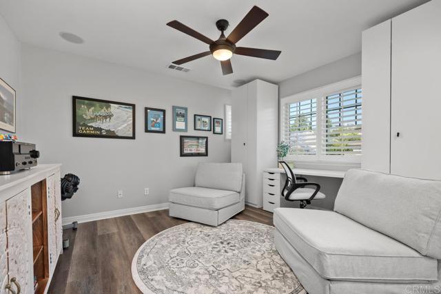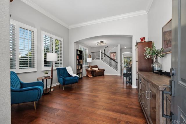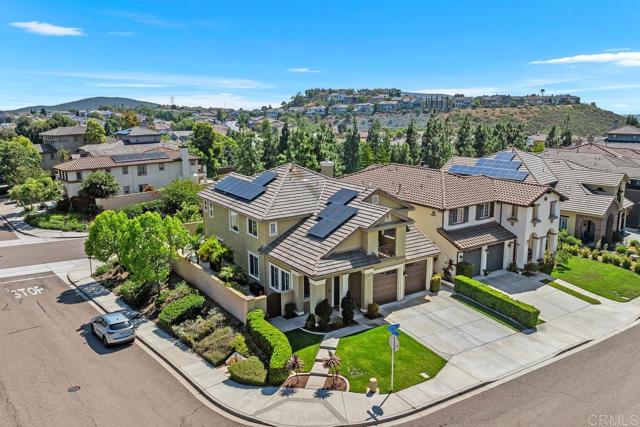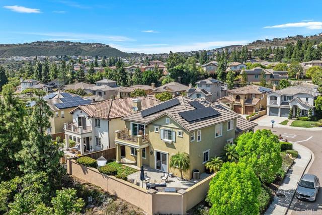 Beautifully upgraded 5-bedroom + loft, 2.5-bath home on a corner lot in the highly desirable community of San Elijo Hills. Situated on a peaceful cul-de-sac, this property offers owned solar, designer finishes, and incredible versatility for modern living. Step into an open-concept layout filled with natural light and high-end touches including reclaimed barn wood and luxury vinyl plank flooring, crown molding, recessed lighting, and fresh paint throughout. The recently renovated kitchen features white cabinetry, granite countertops, a full-height backsplash, stainless steel appliances, a center island, and a five-burner gas cooktop—opening seamlessly to the warm, inviting family room with a cozy fireplace. Upstairs, the spacious loft offers flexibility as a potential sixth bedroom, office, game room, or media space. One of the secondary bedrooms opens via French doors to a private covered deck, while the luxurious primary suite includes a walk-in closet, a balcony with hillside views, and a spa-like ensuite with Italian travertine tile. Downstairs, a fifth bedroom currently functions as a professional music studio with its own mini split system—ideal as a guest suite, home gym, or creative workspace. The backyard is a peaceful sanctuary with lush English garden-style landscaping, river rock pathways, curated plantings, a built-in BBQ island, custom fire pit, and a drip/sprinkler system for low-maintenance upkeep. This home is packed with thoughtful upgrades, including an owned solar system and two EV charging stations to support sustainable living. Enjoy enhanced comfort and convenience with a surround sound system, ceiling fans throughout, central vacuum, a zero-maintenance HALO 5 whole-house water filtration system, and epoxy-coated garage floors.