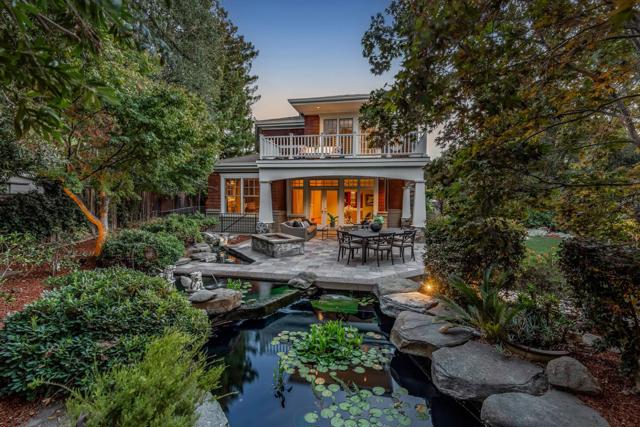 This award-winning residence showcases traditional Cape Cod styling, quality craftsmanship, and impeccable attention to detail around every turn. Custom built and designed to meet the needs of both daily life and large-scale entertaining, this home features 4 bedrooms, 4.5 bathrooms, and 2 offices arranged over three levels. Throughout the home you'll find intricate millwork, gorgeous Australian eucalyptus wood floors, custom light fixtures, and fine stonework. The gourmet kitchen offers an oversized island, Uba Tuba granite, and luxe appliances, and opens directly to the garden-view dining room. The spacious living room has an entire wall of custom cherry wood built-ins, a stately fireplace, and doors to the sun-swept parlor with access to the grounds. Upstairs, the primary suite has a cozy reading nook, a sitting room or nursery, a spa-like bath with a generous walk-in closet, and access to two large balconies. On the lower level you have a spacious family room, a home office, and a bedroom suite ideal for guests. Your serene outdoor retreat stuns with eco-friendly ponds and cascading waterfalls, a fire pit patio, spa, and professionally landscaped gardens. A tranquil escape that feels worlds away, yet just minutes from downtown, top schools, and the heart of Silicon Valley.